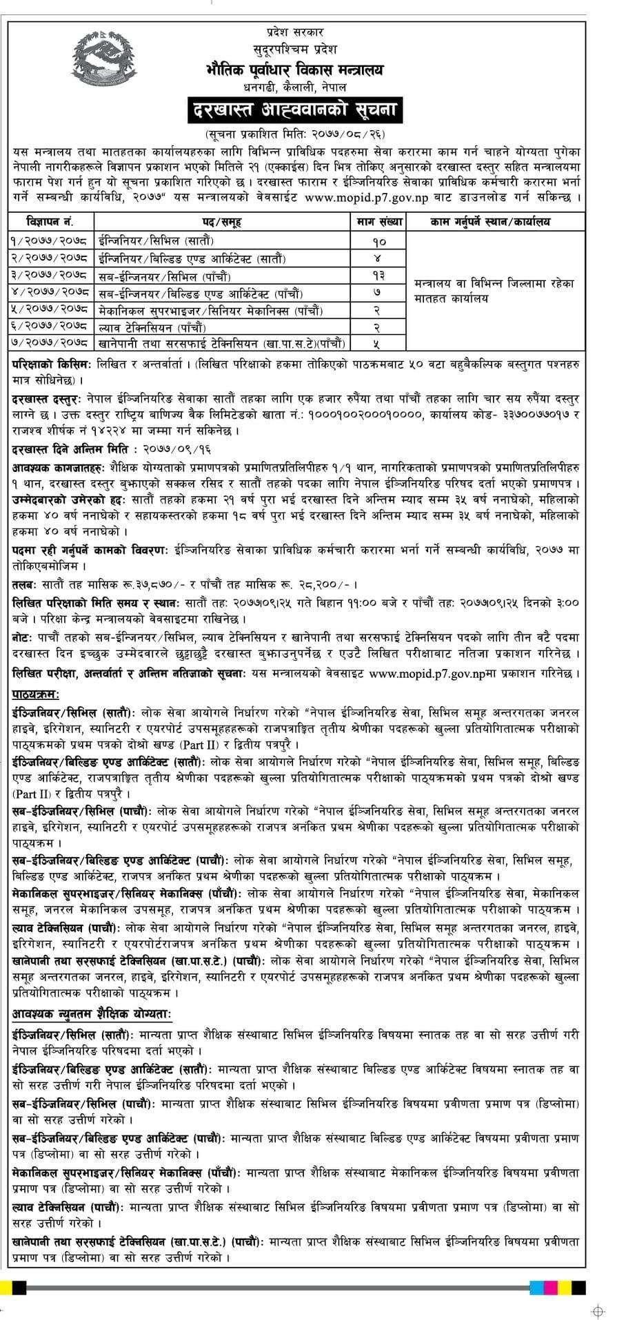सुदूरपश्चिम प्रदेश सरकारले इन्जिनियर र सबइन्जिनियरसहित ४३ जना जनशक्ति माग गरेको छ । प्रदेशको भौतिक पूर्वाधार विकास मन्त्रालयले शनिबार सूचना जारी गर्दै करार सेवामा इन्जिनियर र सबइन्जिनियर माग गरेको हो ।