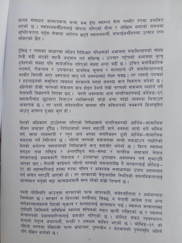 नेपाली कांग्रेसले कोरोना महामारी नियन्त्रण र संक्रमितको उपचारमा जिम्मेवार बन्न माग गर्दै प्रधानमन्त्रीलाई ज्ञापनपत्र बुझाएको छ ।