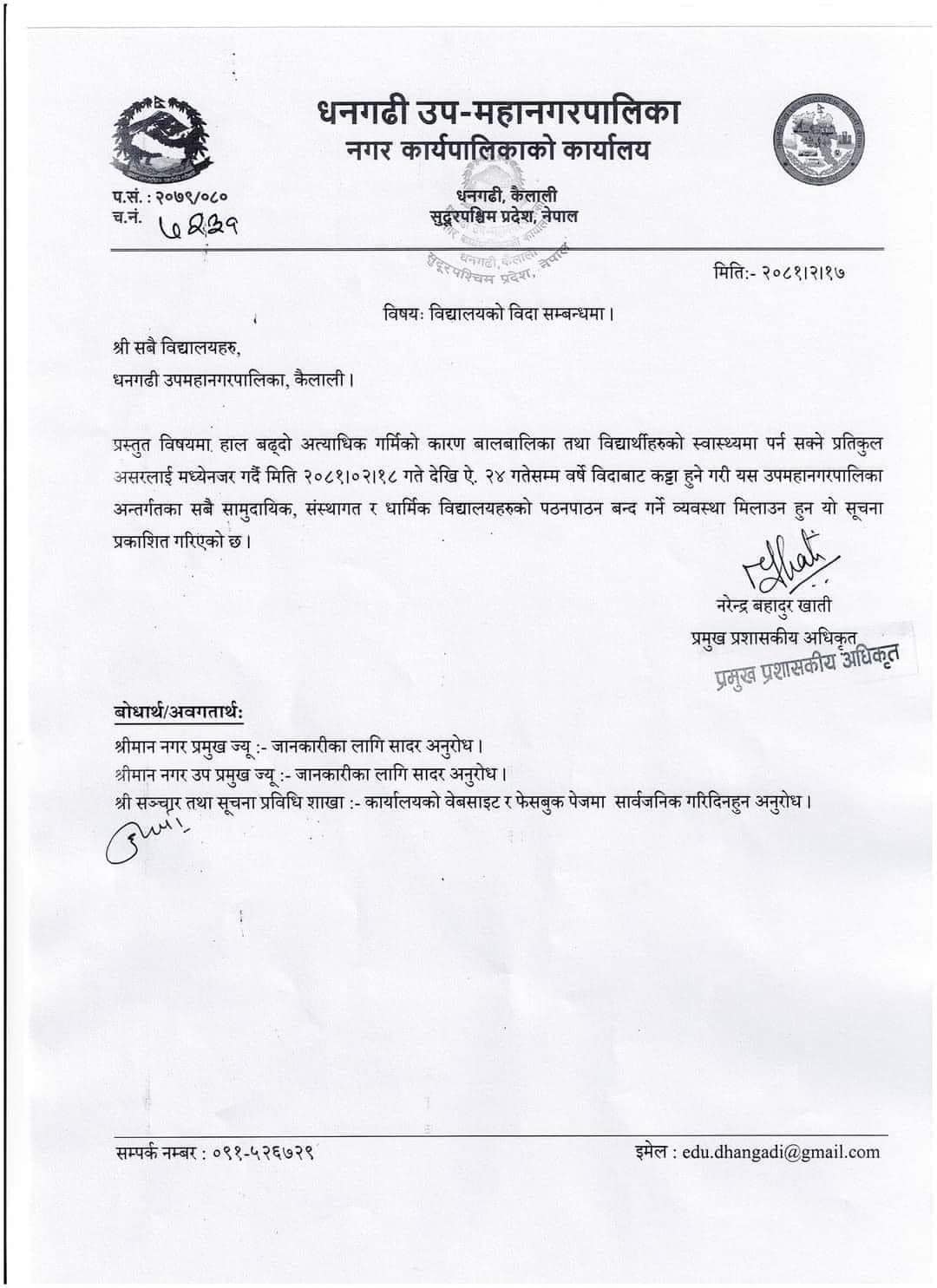 धनगढी, जेठ १७ । गर्मी अत्यधिक बढेपछि धनगढी उपमहानगरपालिकाले नगर क्षेत्रका विद्यालयमा एक हप्ता बिदा दिएको छ ।