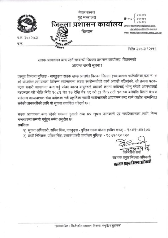जिल्ला प्रशासन कार्यालय चितवनका अनुसार राति १० बजेदेखि बिहान ४ बजेसम्म सवारी आवागमन पूर्णरूपमा बन्द गरिनेछ। पटक–पटक सवारी आवागमन रोक्दा यात्रुहरूलाई समस्या भएको भन्दै अत्यावश्यक बाहेकका सवारीसाधन सञ्चालन नगर्न आग्रह गरिएको छ।